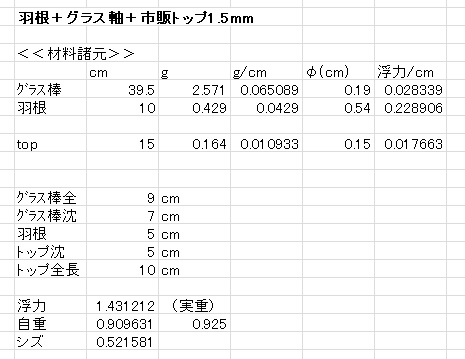 ストロー浮きと同じように浮力と自重を計算してシズが0.5g程度で設計する