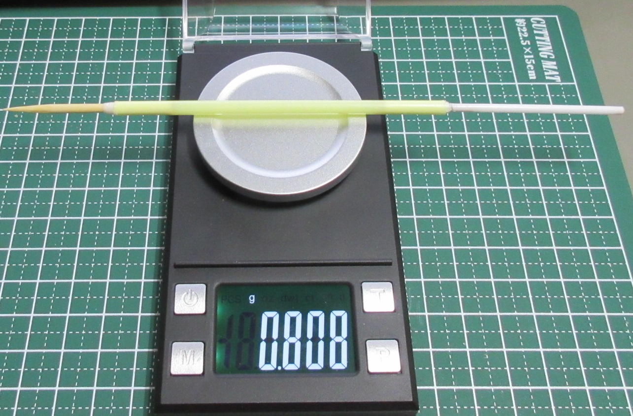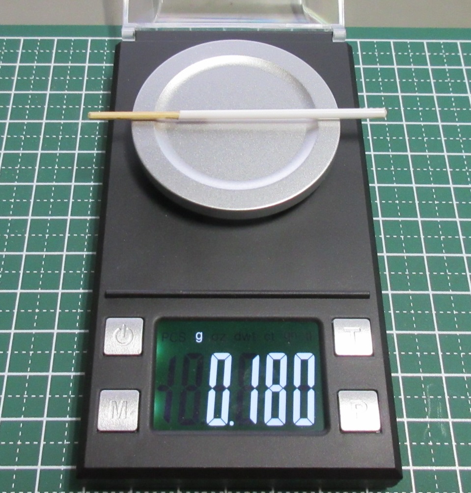 綿棒軸のパイプに竹ひごを接続したトップ部の重さを計量(0.18g)