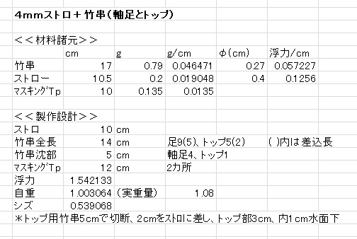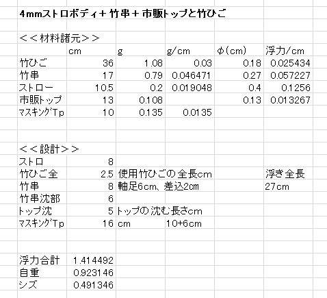 竹串のストローから出る部分は軸足4p(全部水面下)、