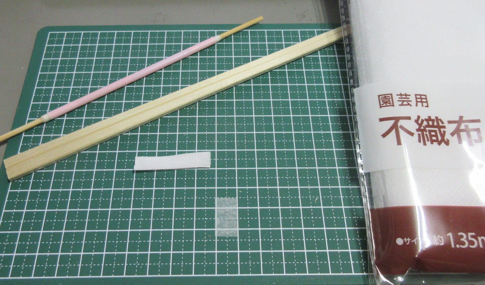 竹ひご・竹串を切断してマスキングテープを巻きつけ、組み立てる